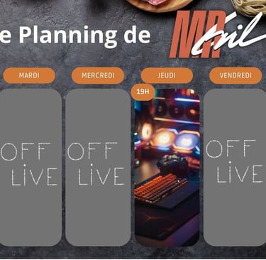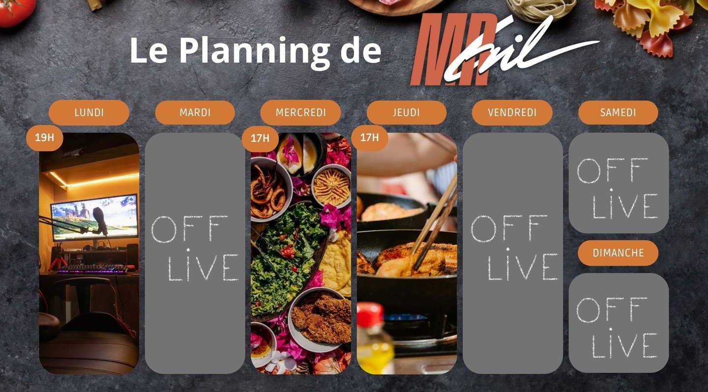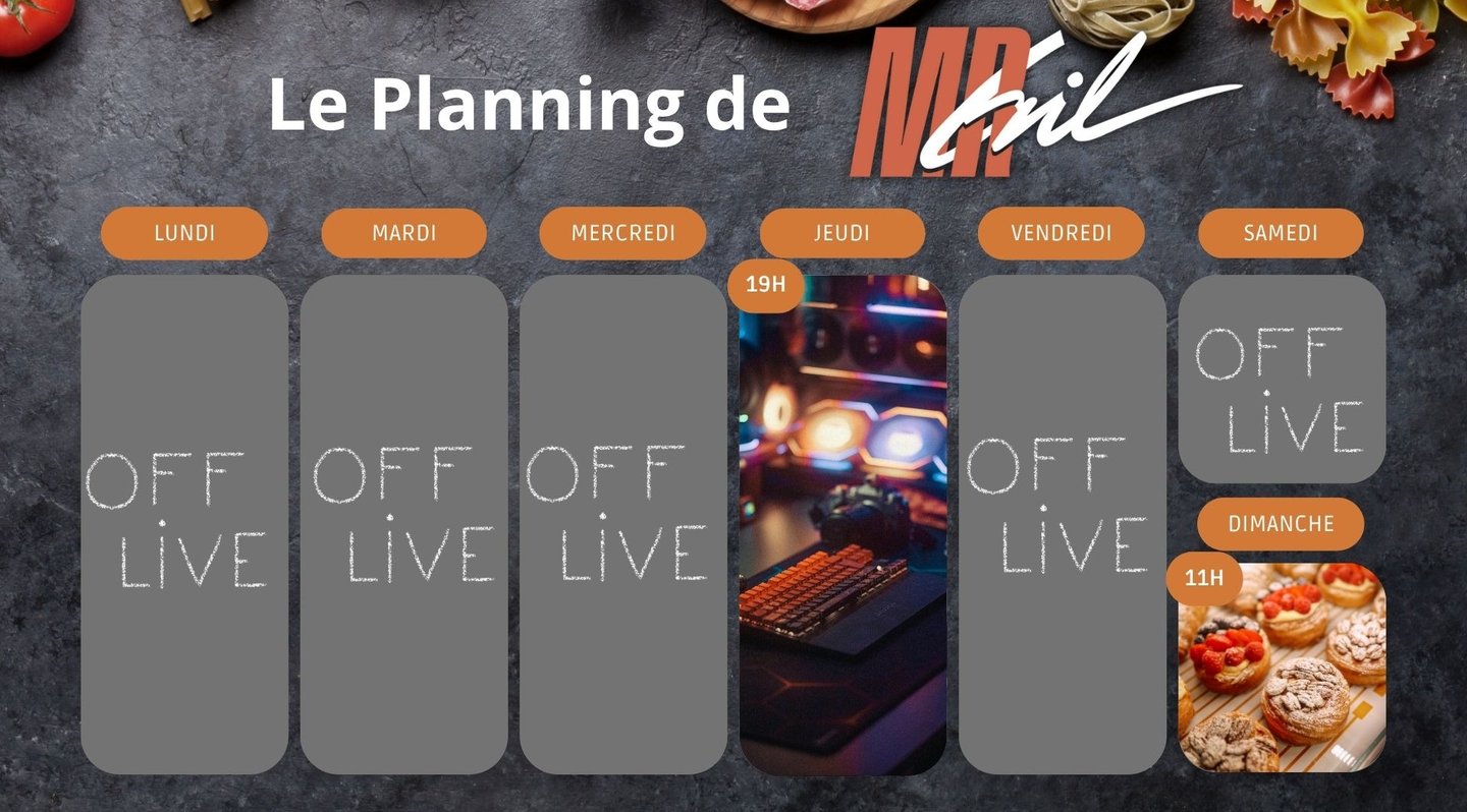 Hey, c'est ici que vous pouvez checker mes plannings de lives chaque semaine !